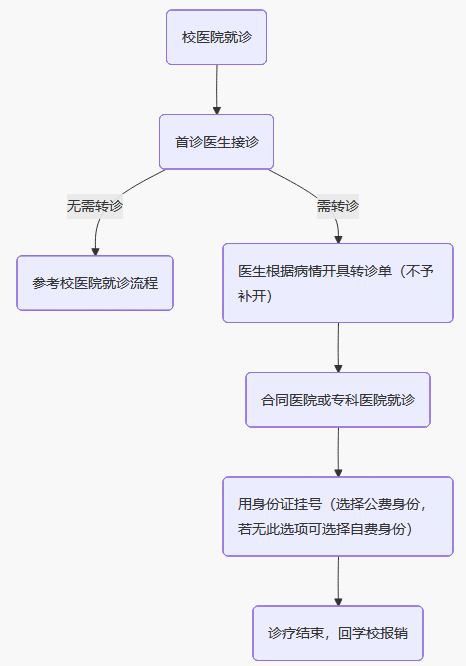 1.重要提示:转诊单不能事后补开,非急诊急症未经校医院开具转诊单,本人先行预约或直接就诊、住院,所产生的医疗费用不予报销。