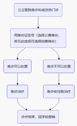 在京外交流、进修学习人员(含交换生)、学生异地实习期间患急病需要就医的,应在当地就近的公立医院急诊就诊,挂号时,费用类型选公费医疗,如无公费医疗选项,可以选择非医保、自费身份,持就诊医院开具的急诊诊断证明并加盖诊断章、急诊病历、急诊处方、急诊医疗收费发票、费用明细审核报销,同时应提供所在院、部、处出具真实有效的交流或实习证明。